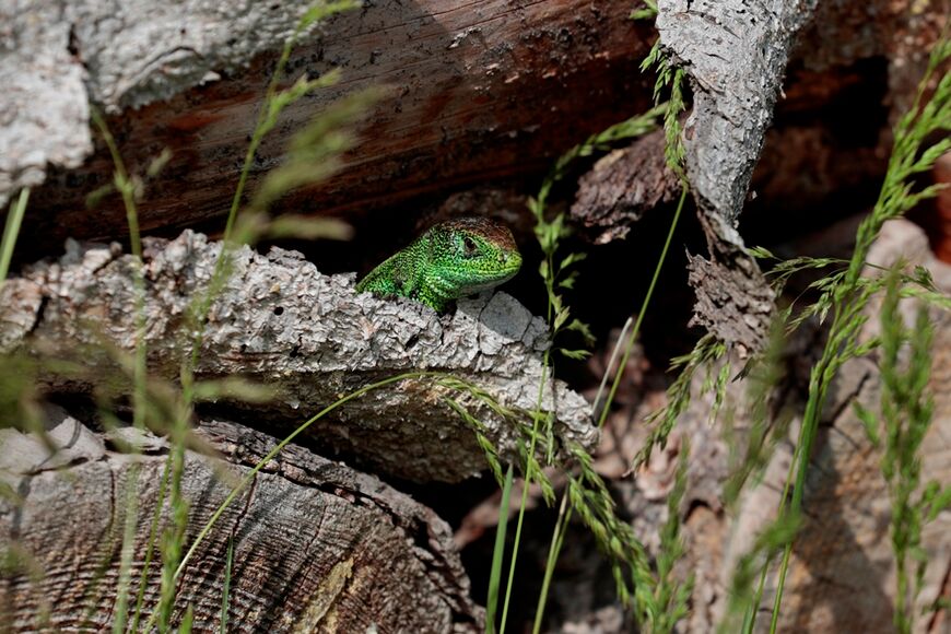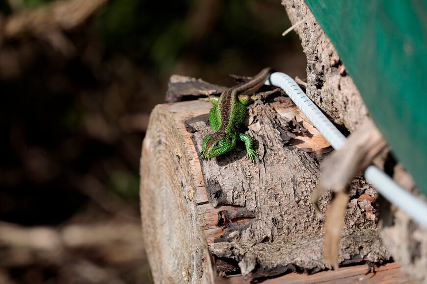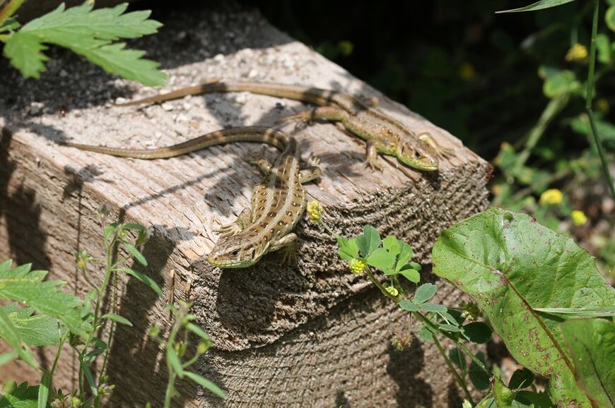 Am Waldrand zum Trocknen gestapelte Holzscheiter, die mit Folie oder Blech abgedeckt sind, werden von vielen heimischen Reptilien aber auch Amphibien gern als Ruhestätten genutzt.
