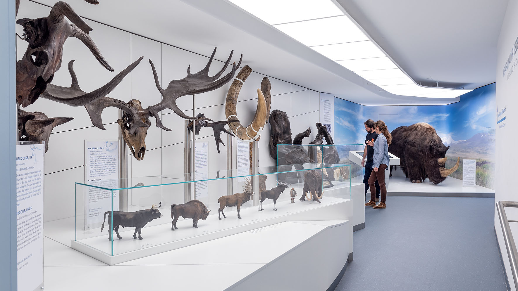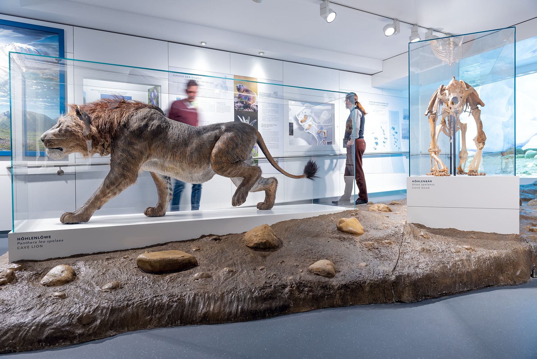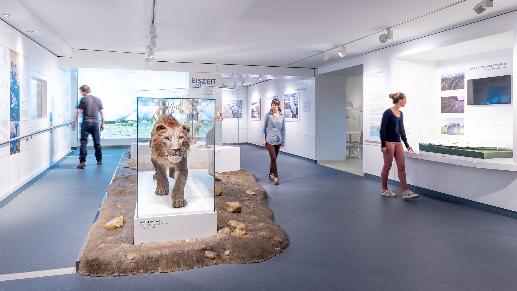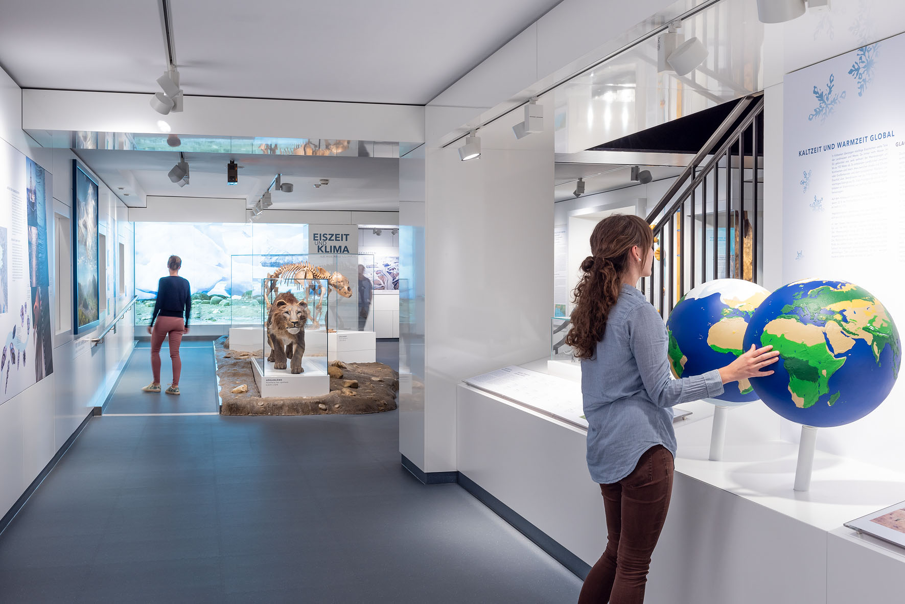 Die Ausstellung „Eiszeit und Klima“ gibt Einblicke in die letzten 2,6 Millionen Jahre der Erdgeschichte: Das Zeitalter der Eiszeit ist geprägt durch ein ständig wechselndes Klima, das unsere Landschaften sowie die Tier- und Pflanzenwelt immer wieder veränderte. Es ist auch das Zeitalter der Menschen, die sich aus Afrika kommend auf der Erde ausbreiteten. Ein Fokus der Ausstellung liegt auf den ausgestorbenen Großtieren, die in dieser Zeit bei uns heimisch waren. Sie zeigt Originalfunde wie etwa das Skelett eines Höhlenbären, Abformungen einer Wollhaarnashorn-Mumie und lebensgroße Modelle von Mammut, Riesenhirsch und Höhlenhyäne.